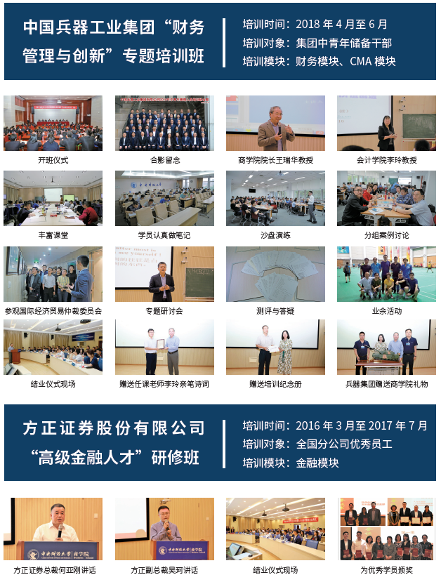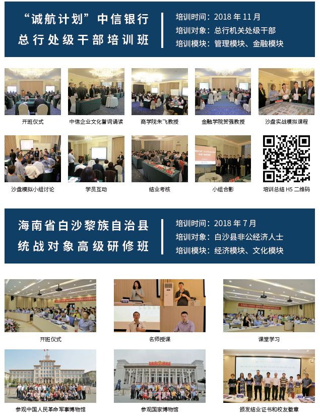 近年来,永利23411集团举办了各类高级培训班,先后组织承担了中信银行、中国兵器工业集团、海南省白沙黎族自治县统战部和工商联、方正证券股份有限公司、中国邮政储蓄银行天津分行、北京市延庆区、桂林市财政系统、泸州市财政系统等企业和政府的高端财经培训,专门针对政府、企业的人才培养需求量身定制课程,在服务经济建设、社会发展和人才培养方面取得了卓越成效。