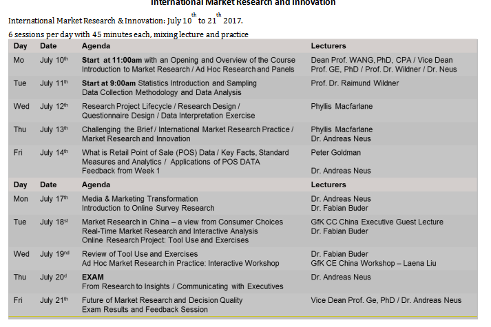 This course is co-supported by Gfk Vereinand invites experts either from business practice and from academia. The courseis on the subject of market research and teaches qualitative andquantitative research methods along with the ways of designing market research,collecting data and utilizing analytical tools. Via lectures and casediscussions, participants are able to have abundant access to the mostup-to-date theories and hands-on experiences. Certificates will be provided byboth CUFE and GfK after the course ends and all relevant criteria met.Additionally, GfK would like to provide the top students in class with theopportunity of having an internship in its Chinese branch.