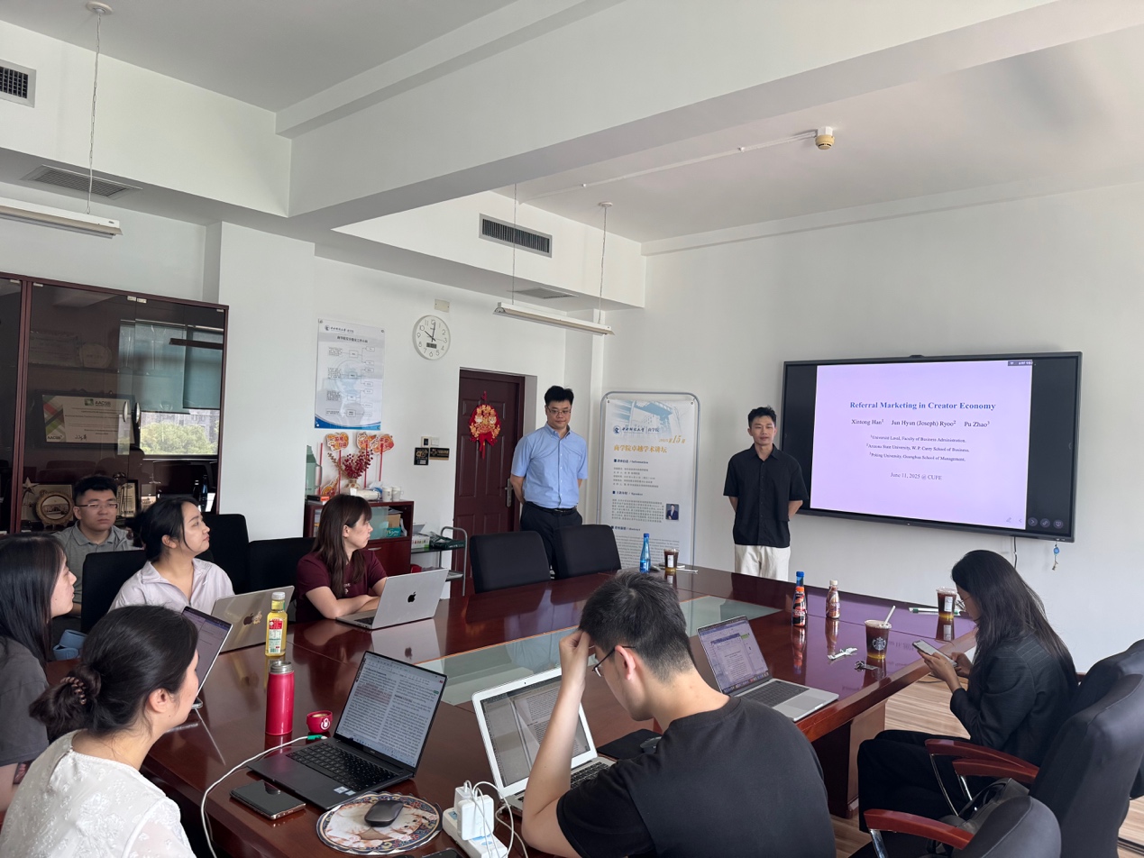 讲座由永利23411集团市场营销系助理教授魏闯老师主持。在讲座开始前,魏老师简要介绍了赵璞老师的履历。赵璞老师是北京大学光华管理学院市场营销学系助理教授。本科毕业于加利福尼亚大学洛杉矶分校(UCLA),获数学、经济学、政治科学三专业文理学士学位。2024年毕业于波士顿大学,获工商管理博士学位(市场营销方向)。赵璞博士的研究领域主要是量化市场营销策略设计与优化、数字平台设计与规制等,尤其关注数字平台创作者、消费者以及平台自身这三方的决策权衡。