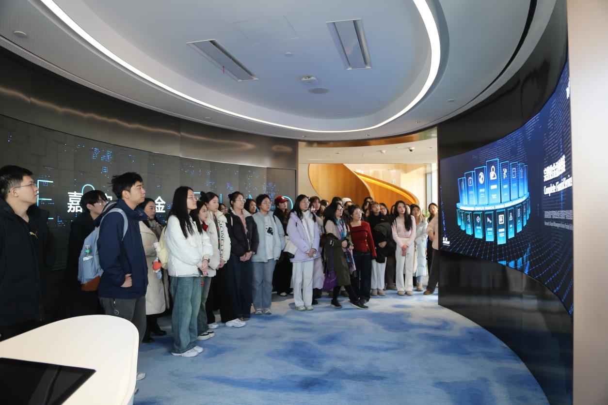 研学第二站,研学团队抵达嘉实基金,开启金融行业沉浸式学习之旅。作为国内最早成立的10家基金管理公司之一,嘉实基金已发展成为资产管理总规模超16000亿元的行业标杆,累计获得91座金牛奖等权威荣誉,其业务覆盖公募、专户、养老金、海外投资等多个领域,实现了资产类别的全覆盖。在企业代表的引导下,师生们参观了公司办公区域与荣誉展示区,通过“嘉实看板”系统直观了解了公司27年的发展历程、投研一体化建设成果及公益投入情况——截至目前,嘉实公益累计投入已达2.06亿元,聚焦西部贫困儿童教育等领域。