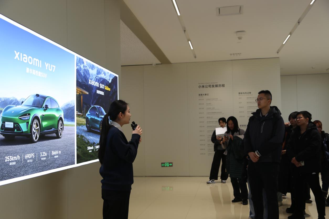 在科技展厅,企业讲解员围绕小米发展历程、核心技术布局与全产业链生态进行系统介绍。师生们近距离观摩了小米多款主力车型,详细了解各车型的设计理念、功能定位与风格特色,直观感受企业以用户需求为核心的创新思维;展厅内陈列的智能家居产品,进一步展现了小米跨场景生态融合的发展布局,让同学们对“科技服务生活”有了更鲜活的认知。