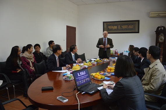 2013年10月25日上午,来自美国路易斯安娜州立大学的MBA项目主任Edward Watson教授、Ye-sho Chen教授及校友Kirk Fisher先生一行来到我校,就我校与路易斯安娜州立大学开展MBA咨询课程合作等事宜进行会谈。MBA教育中心副主任贾晓菁副教授以及学生代表梁京晶、刘琛、吕琛、宋春江等同学在MBA中心会议室会见了客人。