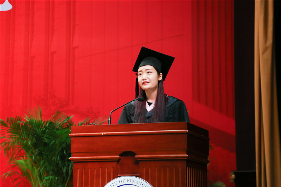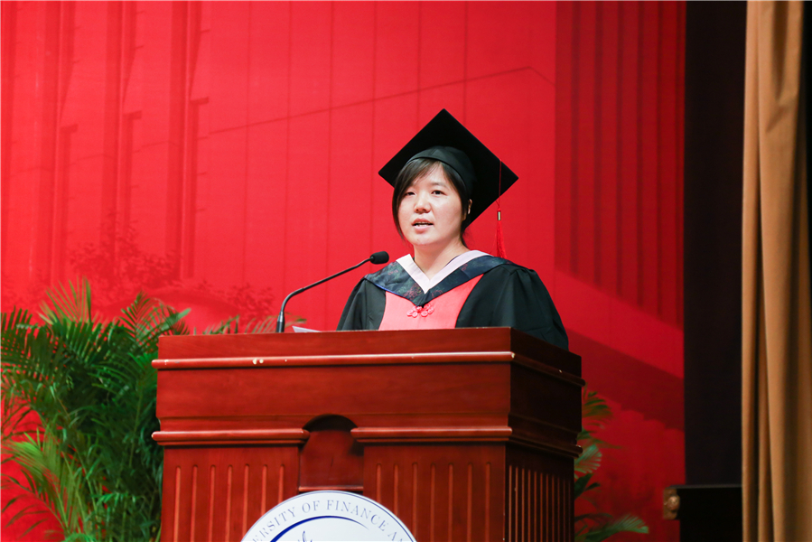 2012级本科生曾戬媛、2014级学术性硕士生蕾拉、2014级MBA硕士生殷丽莉、2013级博士生韩慧林分别作为毕业生代表发表了毕业感言。代表们回顾了难忘的校园生活,衷心感谢老师们付出的心血和汗水,感谢同学们彼此之间的关爱和帮助,感谢亲友们在自己求学之路上的支持!他们表示,作为中财的毕业生,他们一定自觉担负起时代赋予的历史重任和光荣使命,秉承母校“忠诚、团结、求实、创新”的校训,牢记老师们的谆谆教诲,在今后的工作中谱写新的篇章,创造新的辉煌,以骄人的成绩为母校增光添彩,为实现中华民族伟大复兴的中国梦努力奋斗!来自物流管理专业的曾戬媛同学已被美国俄亥俄州州立大学哥伦布分校录取,她的2012级本科同学中还有30位小伙伴也将分赴海外,前往伦敦政治经济学院、纽约大学、新加坡南洋理工大学等国际知名高校深造;而学术型硕士研究生代表蕾拉则是来自非洲马里共和国的留学生,她用流利的中文表达了她对yl23411永利集团、中财永利23411集团师生友人们的感谢,要将这份真挚的情谊带回她的祖国!
