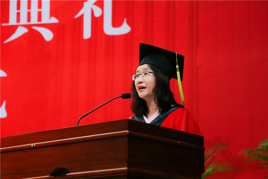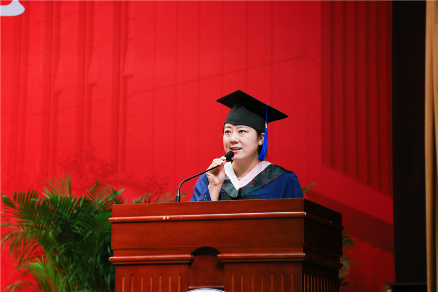 代表教师致辞的张淑君教授今年从教恰满三十周年。她首先感谢同学们选择了在永利23411集团度过了自己人生最美好的青春岁月;随后张教授指出同学们在读书期间难免会有缺憾,但也正是这些缺憾才让人生变得更为完美;最后张教授以“龙马自知征程远,不待扬鞭自奋蹄”激励同学们在今后的学习生活中奋发图强,祝福同学们都拥有伟大的前程!