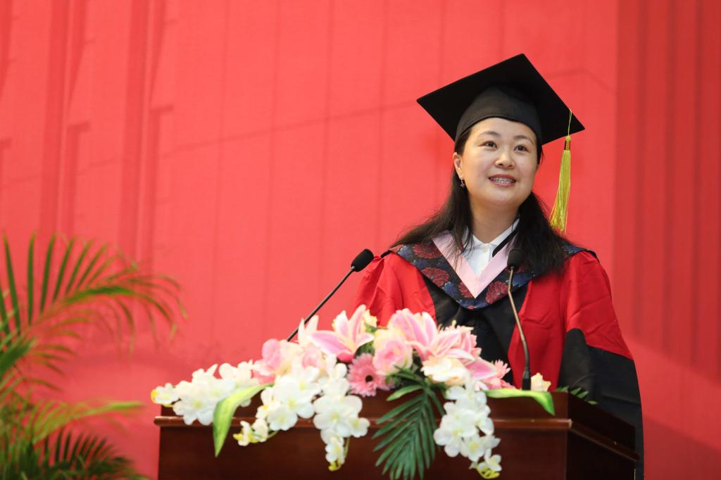 市场营销系李季副教授作为教师代表致辞。她对全体2018届毕业生表达了由衷的祝贺,并与大家分享了自己的人生感悟。李季副教授提到,让人感到自豪和没有遗憾的事情大多与金钱、地位、名誉无关,而是关乎整个社会的进步以及大多数人的幸福,她鼓励大家能够把“改变社会、造福人类”作为使命,将仁心与良知带到企业的经营和管理中。最后,她希望全体毕业生不以物喜,不以己悲,看自己,看当下,持正念,不负青春,不负此生。