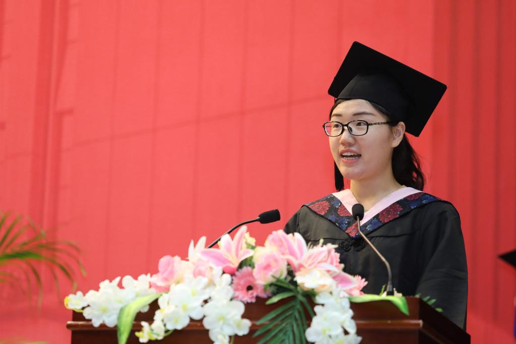 随后,2018届本科毕业生代表穆宁宁、学术型硕士毕业生代表郭懋瑾、博士毕业生代表张帅、MBA毕业生代表肖英满怀感恩之情回顾了在学校的校园生活和青春记忆,并代表毕业生祝福学校和学院各项工作蒸蒸日上,祝福各位老师身体健康、工作顺利,祝福毕业生展翅高飞、前程似锦。
