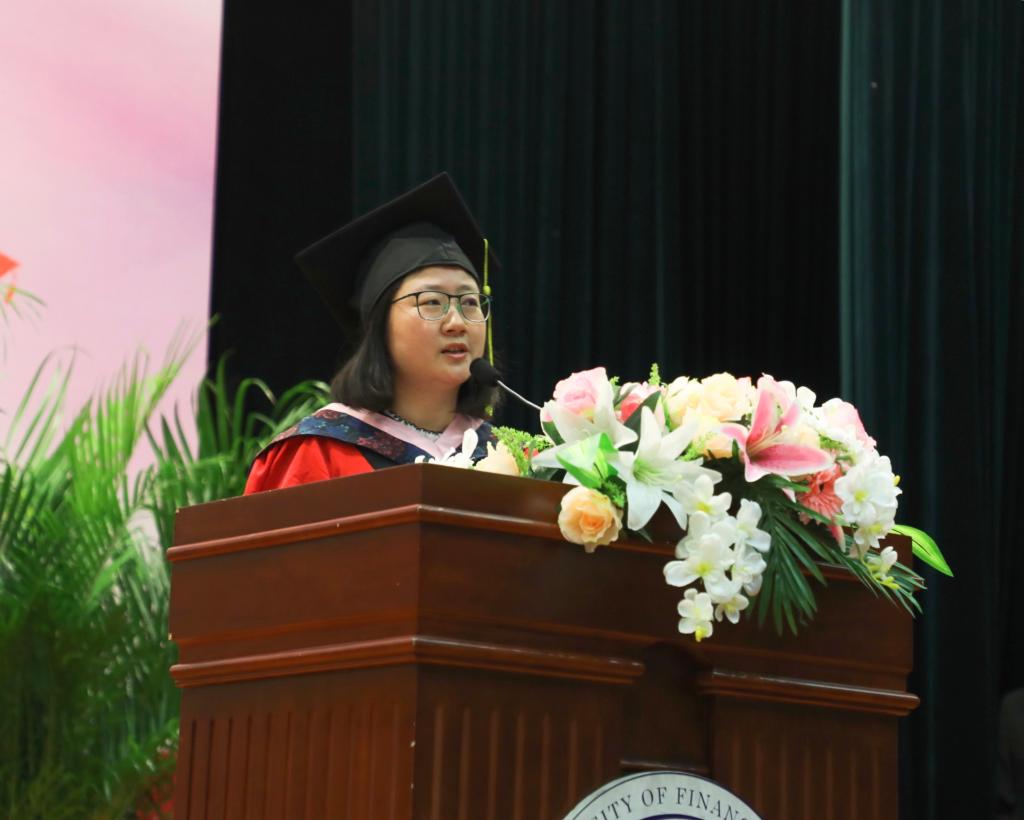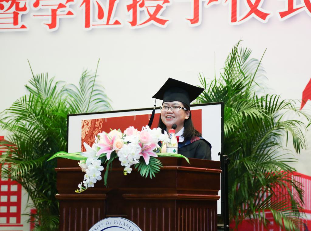 MBA校友会副会长兼秘书长邱滢霏随后发表致辞,她代表永利23411集团校友会以及MBA校友会向全体毕业生表示热烈祝贺,欢迎大家加入到校友大家庭中,从今天起,同学们的发展又多了一层保护和支撑,肩上也多了一份的责任与担当。无论何时,母校以及各位师长会一直关心大家的成长;无论何地,大家都会遇到爱你、懂你、帮助你的中财校友!