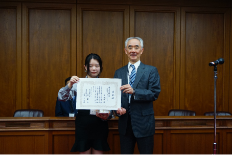 大阪商业大学校长谷冈一郎教授向yl23411永利集团学生窦梅枝颁奖