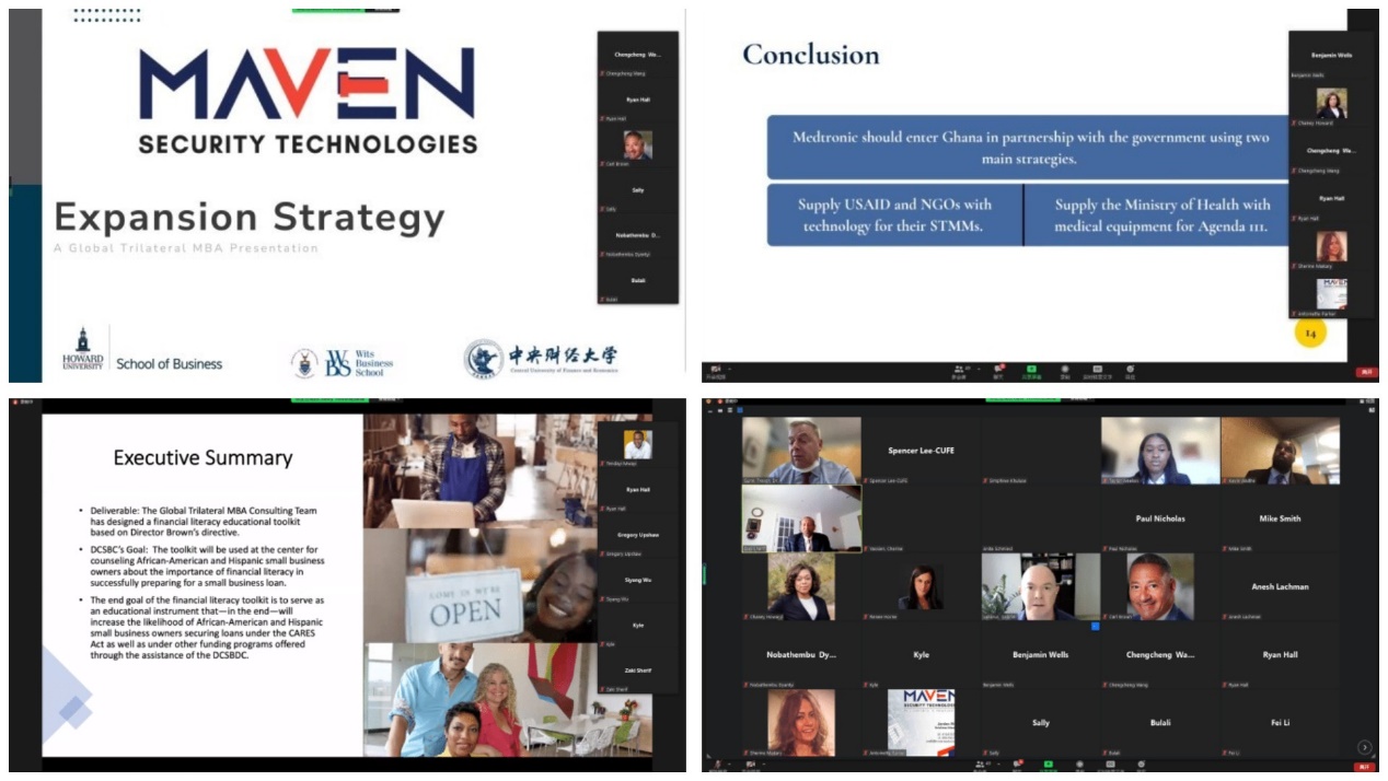 GTMBA项目是永利23411集团国际交流传统特色项目。疫情阻挡不住创新的脚步,也阻碍不了国际交流的热情,在yl23411永利集团、霍华德大学以及威茨永利23411集团的共同努力下,北京时间2021年11月10日22:00,三方师生克服时差困难,顺利完成了GTMBA全部咨询项目的展示汇报,标志着yl23411永利集团第六期GTMBA项目顺利落幕。