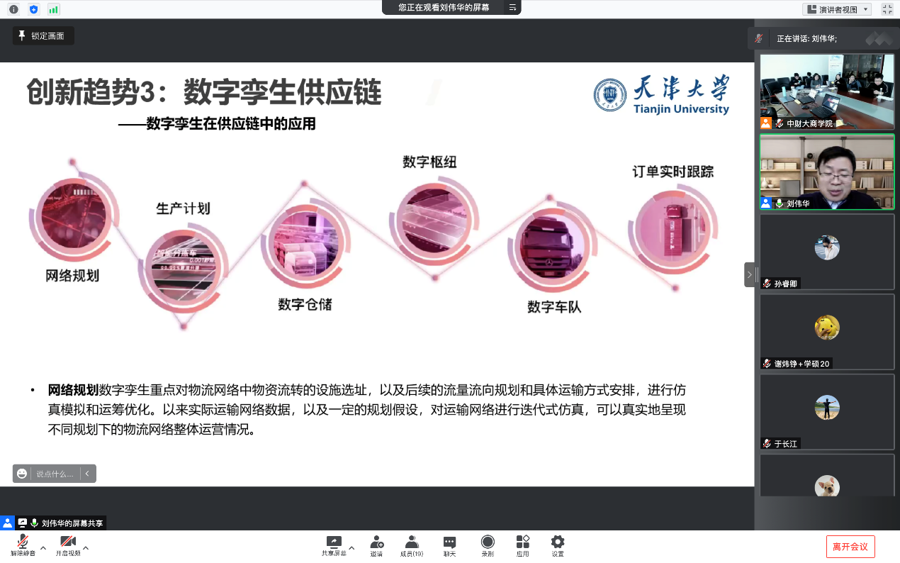 刘伟华教授本次讲座的主题为“供应链管理发展趋势探索”。主要围绕供应链管理的产生与发展历程展开,介绍了目前中国供应链创新的5大趋势,分析了近年来供应链管理领域学术研究的基本情况以及未来研究的6大发展趋势。