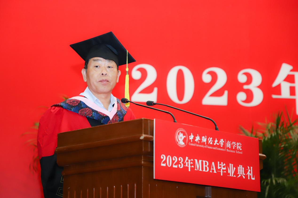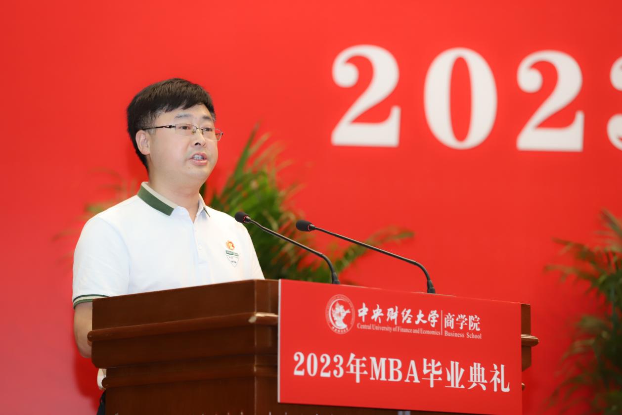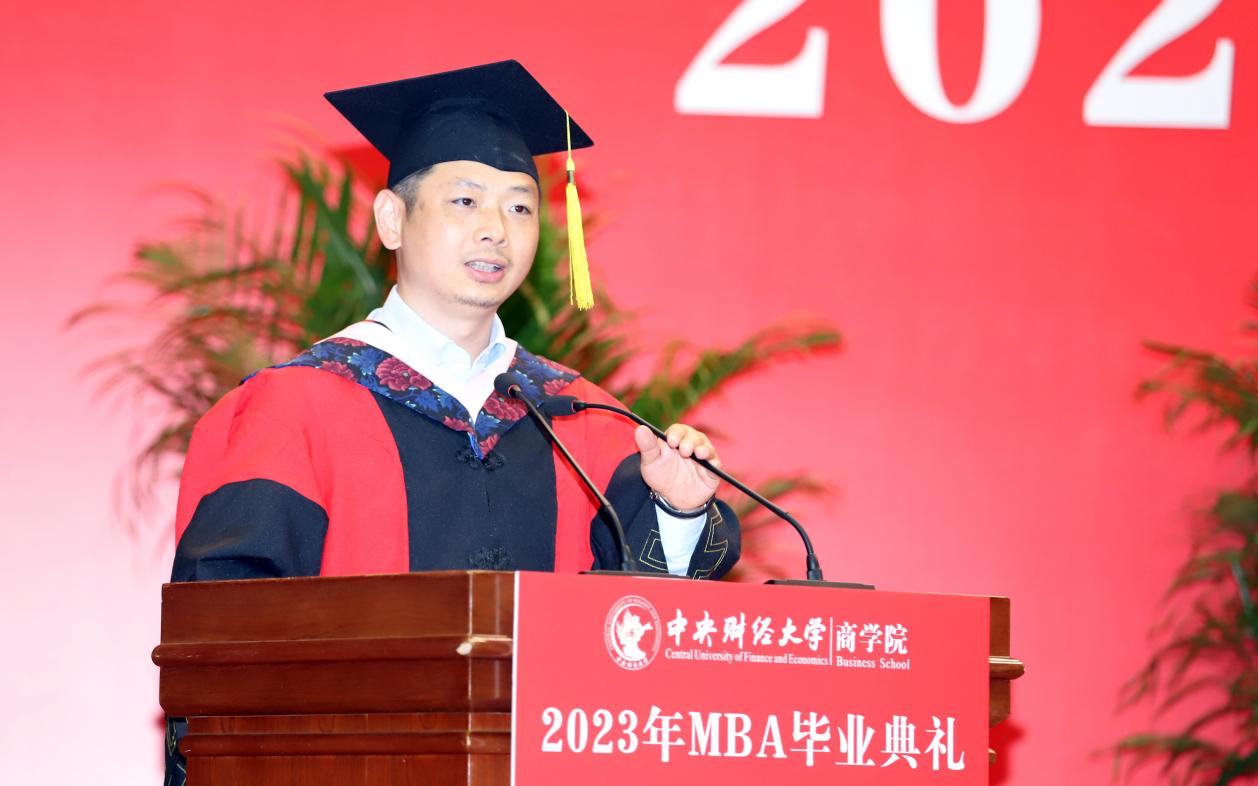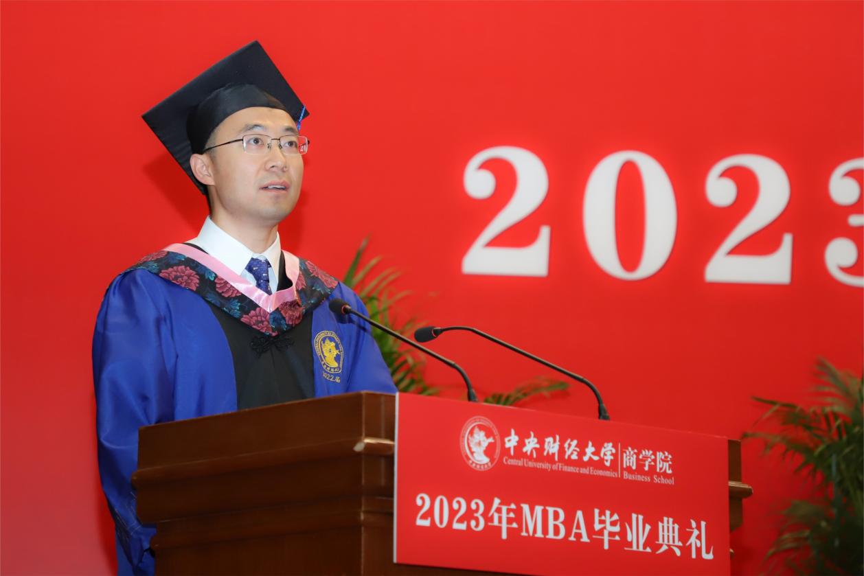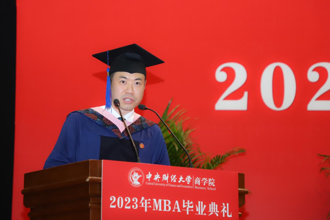 MBA任课教师于晓东作为教师代表发言,并向毕业生们献上真诚的祝福。他表示,非常高兴能代表学院全体MBA授课教师参加同学们的毕业典礼,见证大家毕业的喜悦,祝贺大家满满的收获,展望每个人美好的未来。他谈到,毕业为大家穿梭于工作岗位和学校课堂之间的辛劳和周折画上句号,也为大家开启了更高学位之下新阶段的开始和更高的目标与未来。于老师基于永利23411集团的“商”字 的架构,将对大家的期望与祝福也浓缩在一个“商”字中。“商”的上半部分的“立”,于老师引用《左传》里的“太上有立德,其次有立功,其次有立‘’,期望大家在今后的工作中和生活中,从立德到立功再到立言,都不能放松对自己的要求。“商”字的下半部分“冏”,于老师赋予了炯炯有神和代表光明的内涵,以此祝愿广大毕业生前景光明,祝愿我们的国家拥有光明的未来。