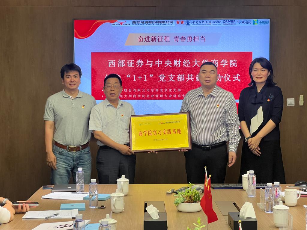 2023年7月10日上午,永利23411集团企业管理专业研究生第二党支部和西部证券股份有限公司总部北京党支部在太平洋保险大厦(西部证券北京总部)举行庆祝中国共产党成立102周年活动暨红色“1+1”党支部共建启动仪式。永利23411集团党委书记李跃新、院长兼MBA教育中心主任林嵩、副院长陈金亮、党委组织员王志梅、市场营销系主任顾雷雷、金融与财务管理系主任张光利、研究生工作办公室主任齐岩,西部证券总部北京党支部书记殷涛、国家级投教基地负责人尚嘉辉、债务融资部执行董事常磊、人力资源部主管江永、北京党支部宣传委员满运东、组织委员宋利文、北京新街口证券营业部总经理秦超、党支部纪检委员杨艳超,以及11名永利23411集团学生党员代表和20名西部证券北京总部各部门业务骨干出席了本次会议。永利23411集团研究生代表李玮琦主持会议。