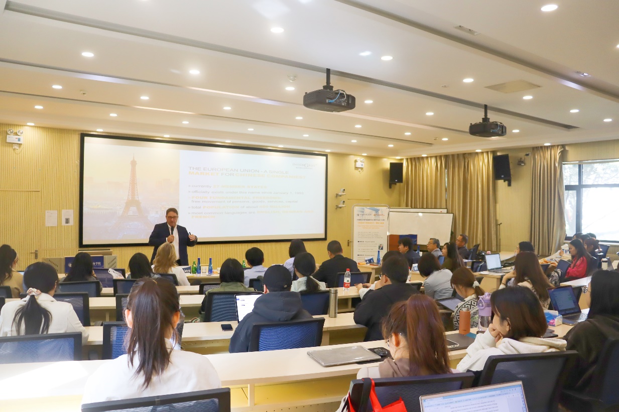 在主旨演讲环节中,首先由Peter Anterist教授发言。Peter Anterist教授系英德杰国际管理公司(InterGest Worldwide)CEO、yl23411永利集团客座教授,其领导的英德杰国际管理公司致力于为国际优质跨国公司提供服务,帮助其建立和管理海外分支机构。Peter Anterist教授以“The European Union- a single market for Chinese companies?”为主题展开,从增值税、最高收入、劳动成本等方面详细介绍并阐述了欧盟内部不同国家的制度和规则差异,并从财政和经济角度说明了欧盟国家的差异性,使同学们对于欧盟国家有了更加深入的认识。