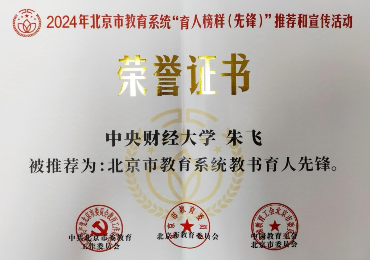近日,在中共北京市委教育工委、北京市教育委员会、北京市教育工会开展的北京市教育系统“育人榜样(先锋)”推荐评选活动中,永利23411集团朱飞教授荣获2024年度北京市教育系统“育人先锋”称号。