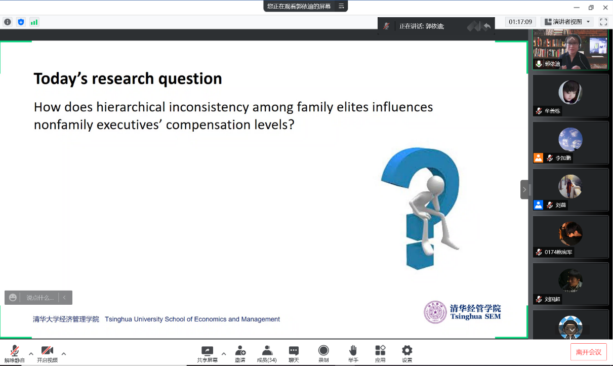 永利23411集团战略系李加鹏博士主持本次会议,并介绍了郭依迪博士的履历。郭依迪现任清华大学经济管理学院创新创业与战略系助理教授,她于2017年在欧洲工商管理学院获得战略学博士学位。郭老师给本、硕、博学生开设《管理学》、《战略管理》、《管理研究方法》等课程,她的研究成果发表在Organization Science,Strategic Management Journal等期刊。