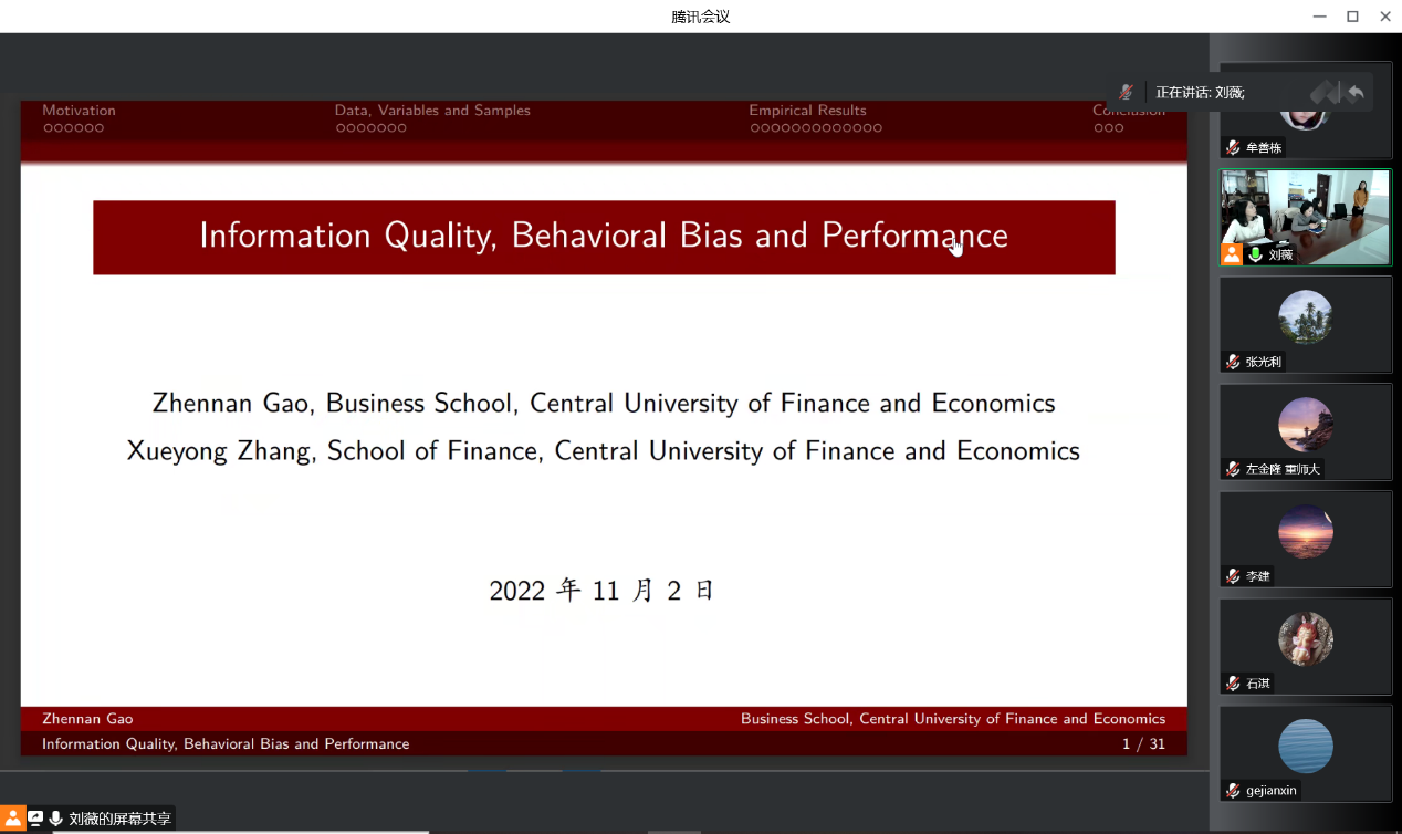2022年11月2日上午11点,永利23411集团通过线上腾讯会议和线下会场结合方式,举办了2022年第十五期永利23411集团卓越学术讲坛。本次讲座邀请了永利23411集团金融与财务管理系高震男博士为主讲嘉宾,包括学院教师、硕博生和本科生在内,共三十余人出席本次活动。