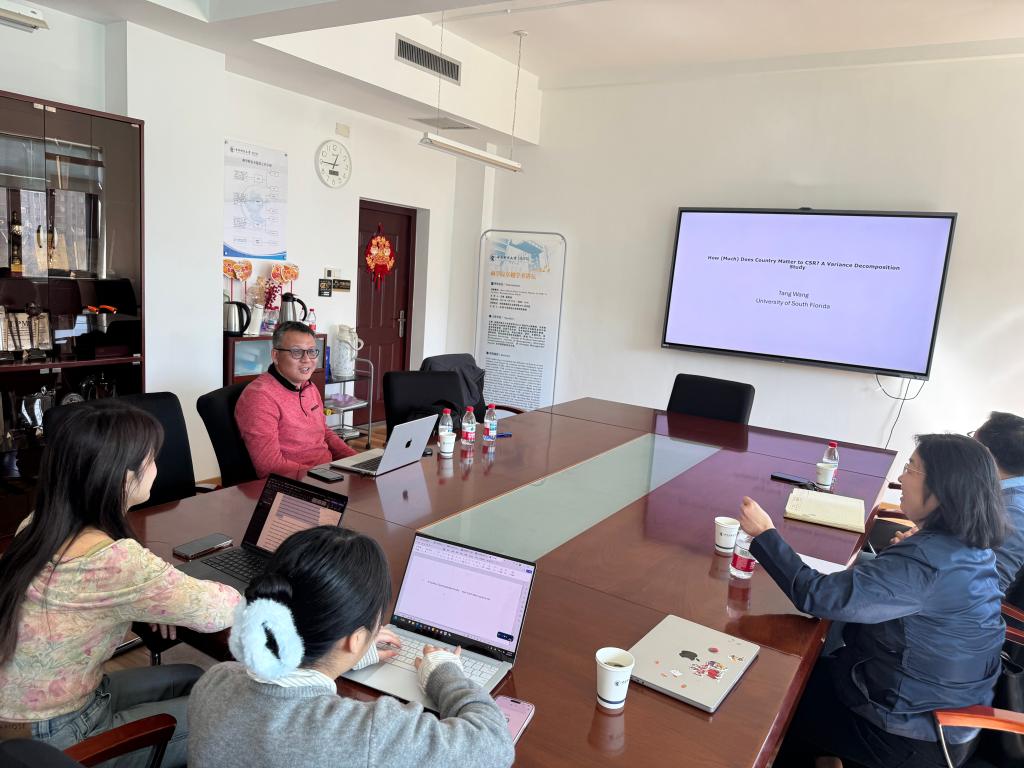 王唐老师是南佛罗里达大学永利23411集团Nault创业中心副教授,负责商业计划等方向的研究课程教学。主要研究方向聚焦在技术创业和创新管理,包括产品开发、学术创业和高层团队管理,研究主要关注高新产业,例如计算机、软件、生物科技、金融科技等,研究成果发表在顶级期刊,例如Strategic Management Journal,the Journal of Business Venturing, Journal of Product Innovation Management, Journal of Management, Strategic Entrepreneurship Journal等,多次荣获最佳论文奖。本次主讲的题目为“How (Much) Does Country Matter to CSR? A Variance Decomposition Study”。本次讲座内容主要关注将国家层面纳入CSR(企业社会责任)差异的分析中,扩展了CSR差异分解研究,揭示了国家特定因素在解释公司间CSR差异中的相对重要性。通过引入非正式制度(集体主义和个体主义价值观)作为调节变量,调节公司、行业和国家效应在CSR差异中的相对重要性,从而推进了对非正式文化规范如何塑造CSR差异的多层次理解。最后,研究提供了关于公司实质性CSR与象征性CSR差异来源的见解,表明象征性CSR差异更多地受到国家因素的驱动,尤其是在集体主义环境中。研究采用来自71个国家、153个行业、4287家公司的25309个样本数据(2003—2020年)进行理论验证,对于理解国内外的CSR战略具有启示意义。