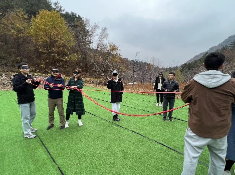 第三个游戏——“盲人方阵”游戏中,两组成员需要蒙眼找到各自的绳子并以最快的速度将绳子围成正方形。两队成员激烈地讨论战略战术,手拉手、心连心,用彼此的信任和智慧构建出最完美的正方形。