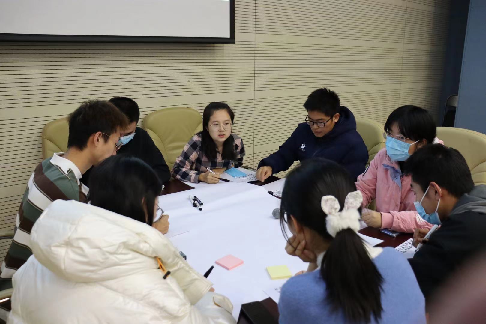 在葛建新书记发布任务后,两组志愿者围绕“在拟定的情境下,是否开展班级2022年新年晚会”议题展开无领导小组讨论。讨论结束后需将形成的一致决策和决策依据进行展示。