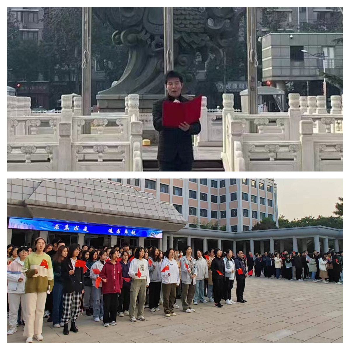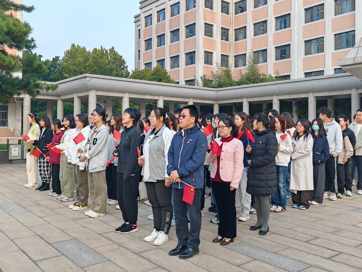 7点整,曦光微明,伴着十月的阵阵秋风,国旗队旗手们迈着坚定有力的步伐走到升旗台前,落地铿锵,整齐划一,随后国歌响起,在激昂的歌声中,在晨曦的照耀下,五星红旗缓缓升起,随风飘扬,全体师生行注目礼,共唱国歌。