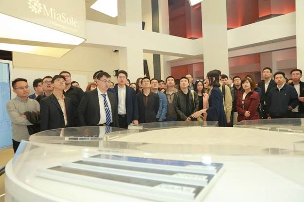 At the start of the visit, Ms. Lin Xiao led the CUFE BusinessSchool delegation to visit the Renewable Energy Exhibition Center. According toMs. Lin, the Center, consisting of eight exhibition halls and one cinema, isthe world’s first specialized science education showroom themed on the “sun andrenewable energy.” Then, she went into details about the revolution of energy,China’s advantages in clean energy, and the thin-film photovoltaic technology.The CUFE delegation gained insights into renewable energy and the technologyfrom this visit.