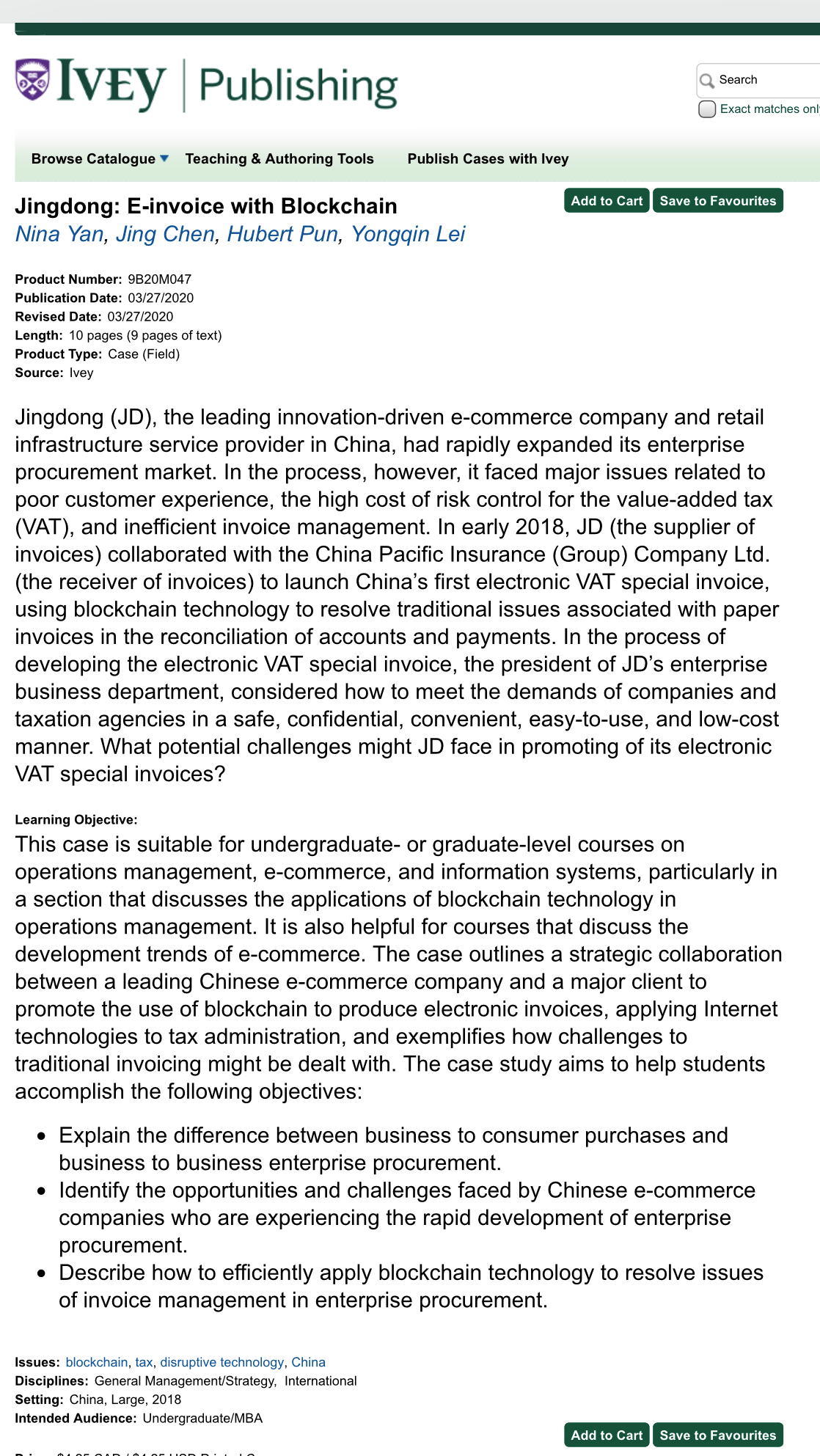 The case "Jingdong: The First Blockchain Electronic VAT Special Invoice",composed by Professor Yan Nina from CUFE Business School andinternational co-authors has been officially accepted bythe internationally renowned case research institution- IVEY Publishing (The Richard Ivey School of Business, The University of Western Ontraiohttps://www.iveycases.com/ProductView.aspx?id=108961).