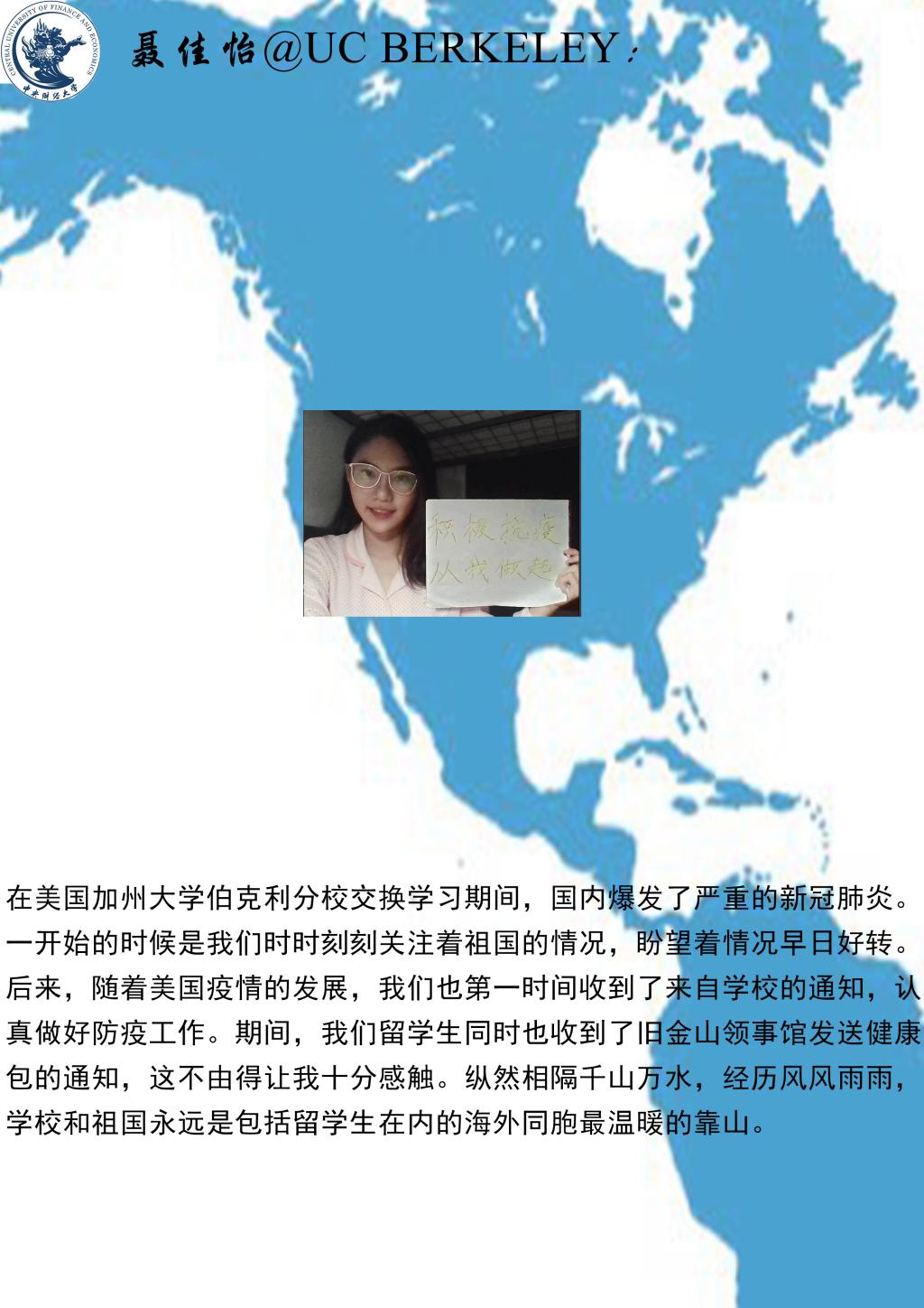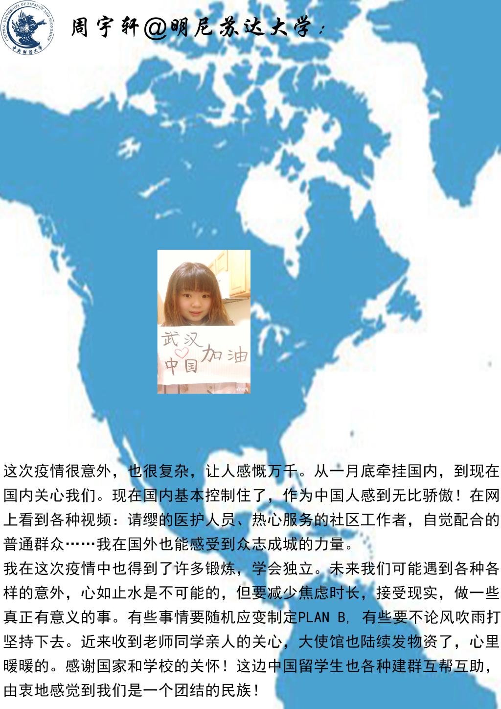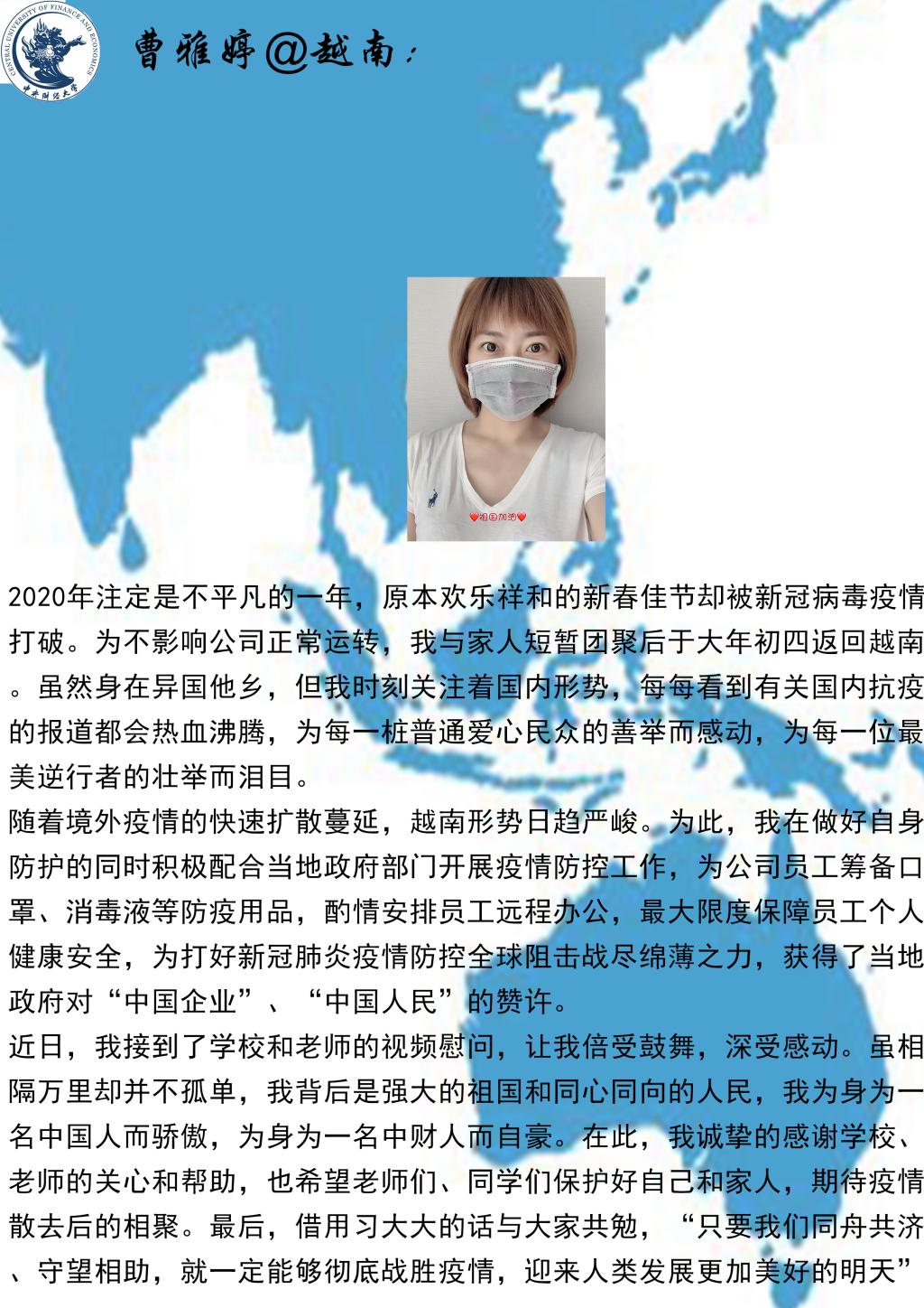 The students reported on their life, work, studying and epidemic prevention, and expressed theirgreetings andconcern to professors and studentsat home, and gratitude for thecareful and thoughtful service of CUFE Business School. The students said that through the epidemic prevention and control, it is necessary to learn the right way ofthinking, to be independent, adapt to changes, reduce anxiety, face reality bravely, and dothose that would really help.