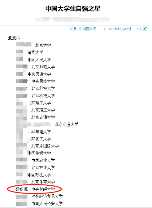 Liang Beiyuan, an Undergraduate Student from CUFE Business School was Awarded one of the “2019 Self-improvement Star College Students” Honorary Title
