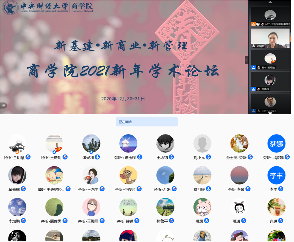 In order to enhance the academic atmosphere and promote the academiccommunications and cooperation between faculty and students, 2 online sessions of New Year Academic Forums under the theme“New Infrastructure • New Business • New Management”were held on December 30 and December 31, 2020. The forums were open to faculty, students and alumni of CUFE Business School.