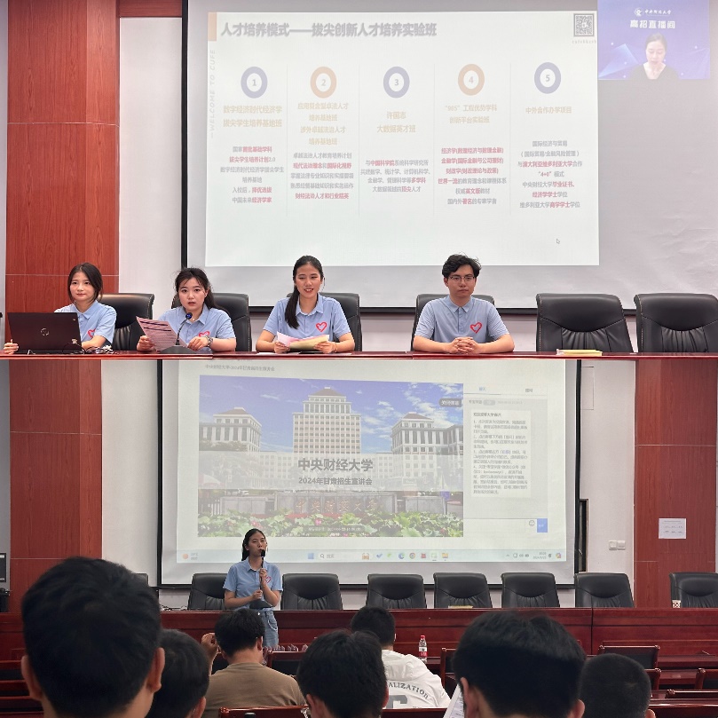 In order to strengthen the cooperation and exchange between the Business School and the high-quality student bases in Shaanxi and Gansu provinces, broaden the enrollment channels, improve the quality of students, and expand the social influence of the Business School, the Business School actively responded to the overall deployment of undergraduate enrollment work of CUFE. From November 2023 to July 2024, the Business School carried out a series of enrollment publicity work under the leadership of the Party Committee of the Business School, and successfully completed the university enrollment and counseling work in Gansu and Shaanxi provinces.