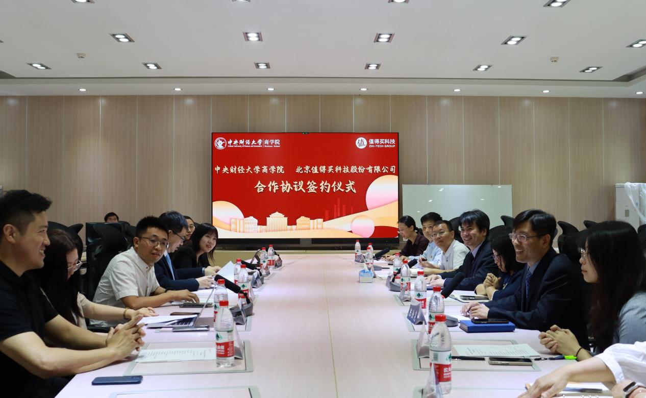 On May 30, the Business School of Central University of Finance and Economics signed a cooperation agreement with BeijingZhi-Tech Group.Lin Song, dean of the Business School of Central University of Finance and Economics and director of the MBA Education Center, YangZhongying, deputy secretary of the Party Committee of the Business School, LiuXiaoyuanand ChenJinliang, deputy deans of the Business School, ZhuFei, deputy director of the MBA Education Center and deputy dean of the Business School, relevant teachers and staff of the Business School, chairman SuiGuodong, senior vice president ChenYingqianand board secretary LiuWeiliangof BeijingZhi-Tech Group, ZhangAichao, executive director of the Consumer Industry Research Institute of BeijingZhi-Tech Group, Wang Ying, vice president of technology & strategic channels of the Consumer Industry Research Institute of BeijingZhi-Tech Group, and relevant staff attended the signing ceremony. The ceremony was presided over by ChenJinliang, deputy dean of the Business School.