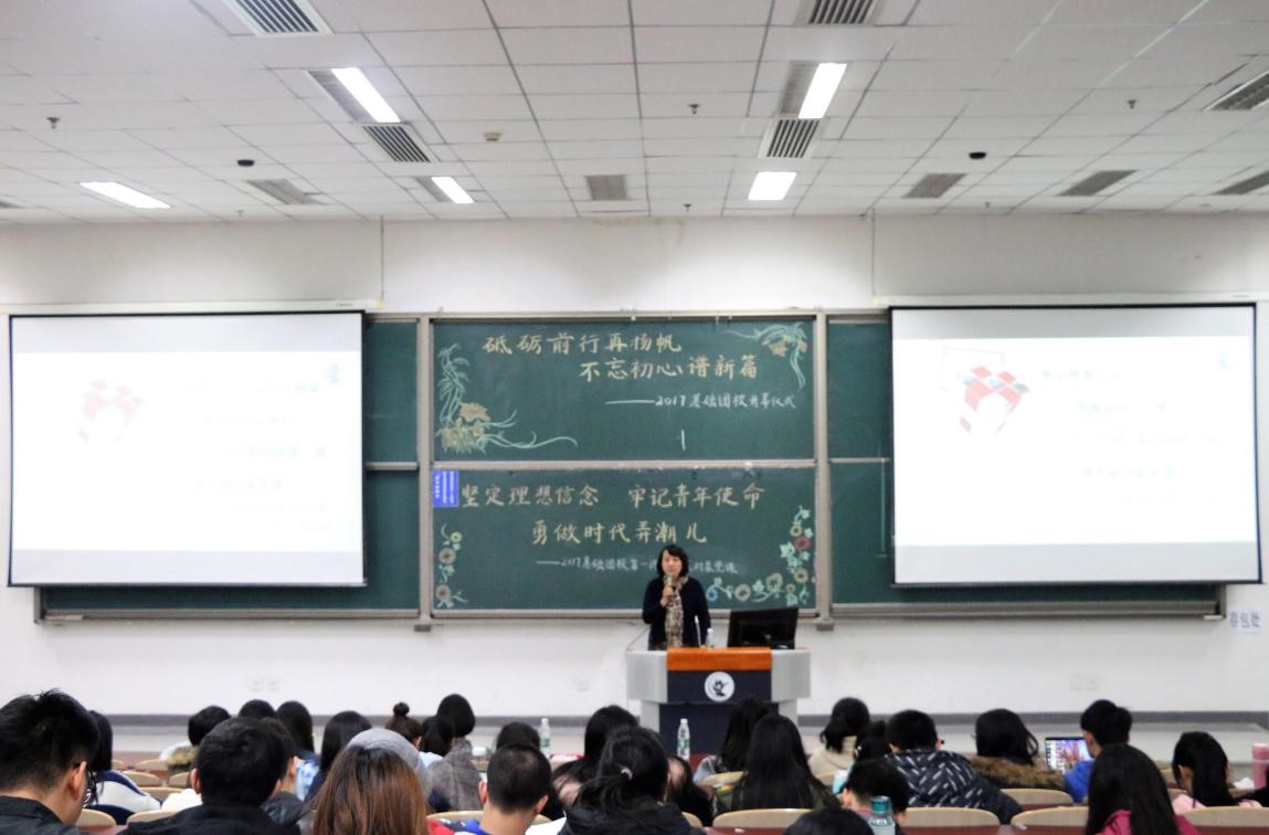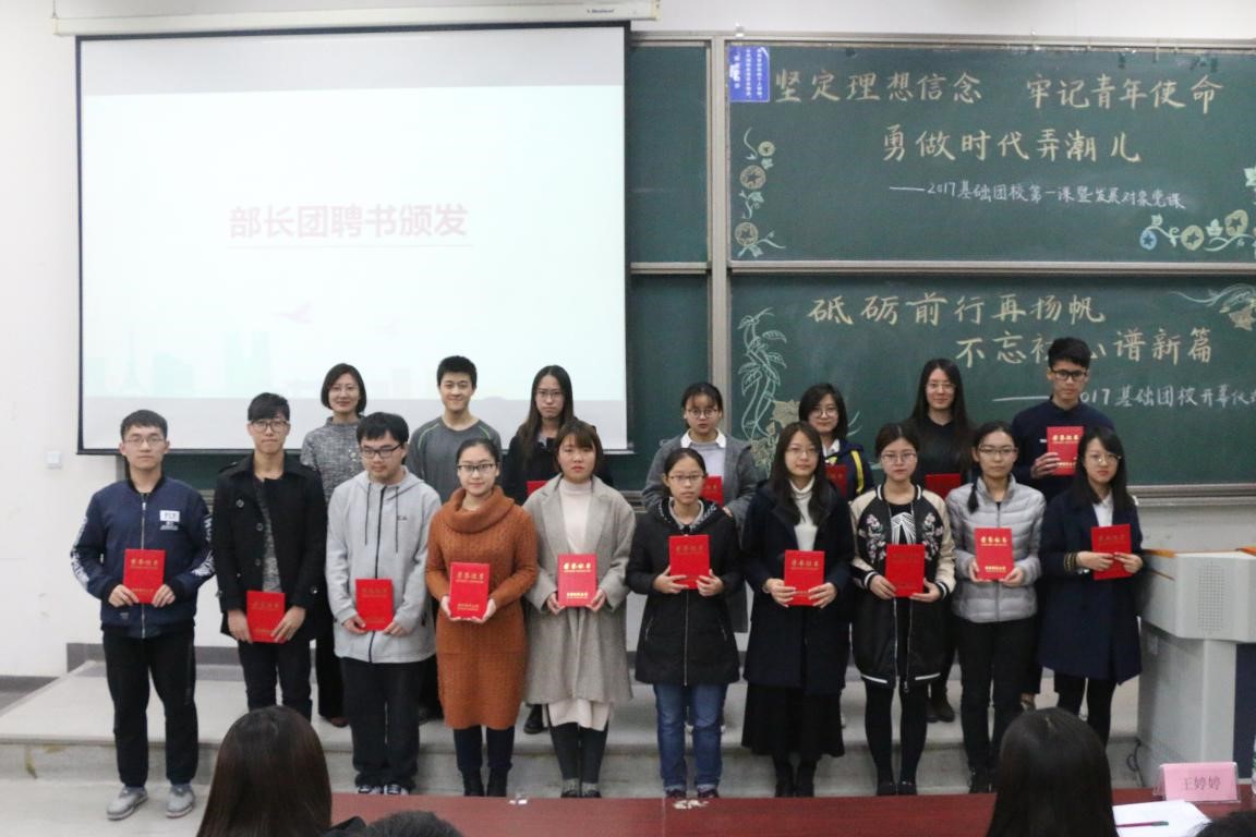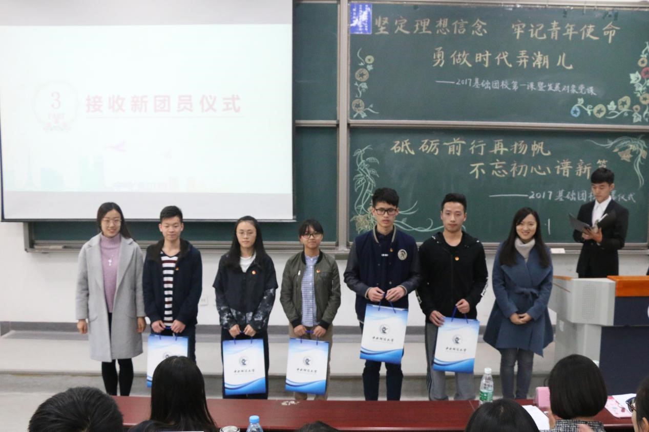 新生团员是此次基础团校培训的重点,2017年9月,永利23411集团团委接收了246名新生团员,成立了7个新生团支部。为了加强新生团支部建设,举办了接收新生团员仪式。由优秀团员代表为新生团员代表佩戴团徽,研究生会主席马雅璇与17-1班芮+导师潘昊宁向新生团支部发放“薪火相传”团务工作资料包。