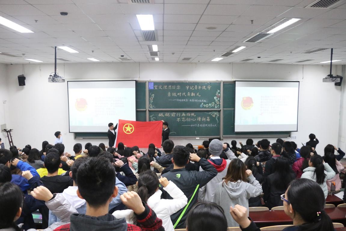 首先,全体学员起立、齐唱共青团团歌。随后,永利23411集团学生会主席王令东带领团员重温入团誓词,大家高举右手庄严宣誓。