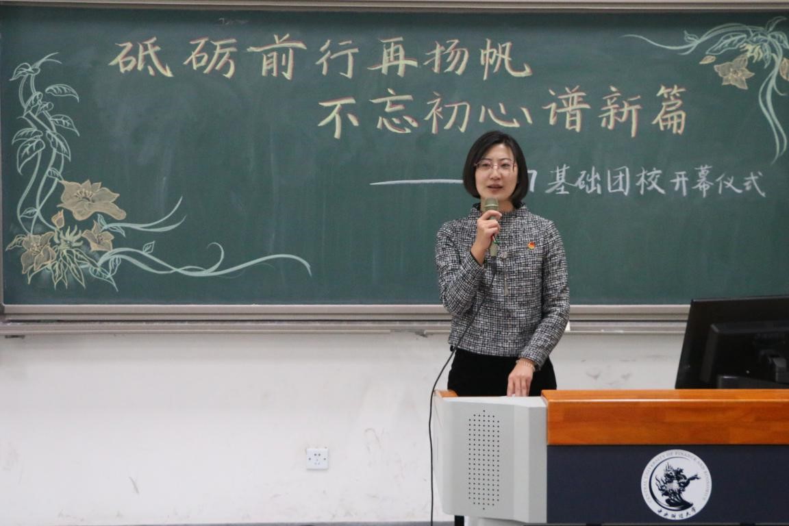 之后基础团校校长王婷婷老师简要介绍了本次基础团校内容安排及学习要求。本次团校培训历时一个月,课程内容包含理想信念教育、党的十九大报告学习系列活动、技能培训、实践活动以及经验交流等,根据大家身份不同选择不同课程。通过基础团校的培训,重点选拔培养可以成为院级“芮+”导师的学生。她希望广大基础团校学员能够结合党的十九大报告的学习,践行青年使命,“用青春拥抱时代”,将个人发展与国家命运相结合,用自身力量影响身边人向好向善发展。