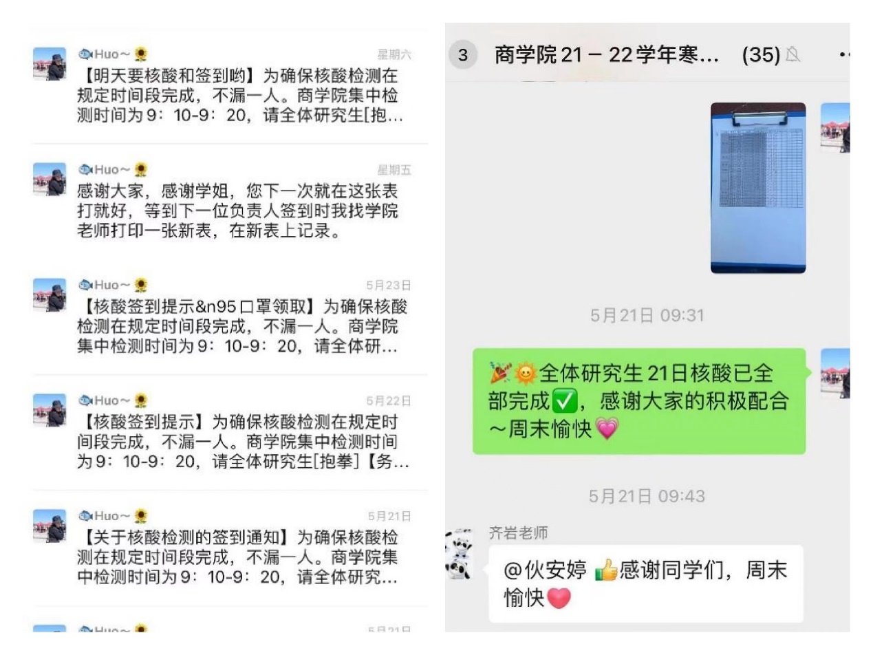 校内师生员工全员核酸工作启动以来,伙安婷同志配合好学院不断细化核酸检测提醒督促工作,科学组织小组负责人以轮值的形式开展现场签到,确保不漏一人。集中核酸前,她总会在微信群内提示同学们核酸的时间、地点以及注意事项;核酸时间最后20分钟,她总是最关注签到情况。在与全体小组负责人、在校研究生的共同努力下,核酸检测工作“0遗漏”,助力学院和学校核酸检测工作顺利开展。