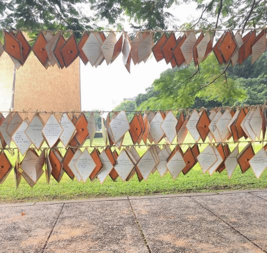 旁边有一排用线穿起来的卡片纸,走近一看全是许愿的卡片。路思义教堂是世界闻名的建筑,但同时也是东海大学的学生每天上课放学的必经之路。路思义教堂的夜景也是十分迷人的,晚上坐在教堂四周的草坪上,有徐徐的凉风吹过,看着夜幕下的路思义教堂,感觉到内心都变得无比的宁静,不再浮躁。