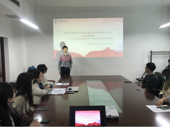 杨开宇同志带领支部党员和发展对象一起学习了习近平总书记在全国脱贫攻坚总结表彰大会上的重要讲话,习近平总书记从5个方面总结了脱贫攻坚取得的重大历史性成就,从7个方面阐述了中国特色减贫道路和反贫困理论。另外,宣讲人还向大家讲解了财政研究和各类企业在脱贫攻坚中的重要作用,参会成员认真聆听杨开宇同志的分享,积极交流自己对我国脱贫攻坚工作取得重大成就思考与心得体会。