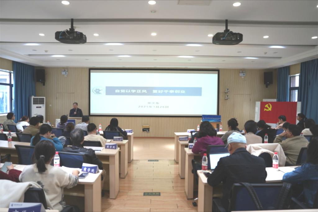 校党委副书记、纪委书记张庆东以“自觉以学正风 更好干事创业”为题,领学了习近平总书记关于深入贯彻中央八项规定精神学习教育的重要指示精神,解读了中央八项规定的主要内容和中央八项规定精神的实质,结合有关制度要求和现实案例分析了违反中央八项规定及其实施细则精神问题的具体表现;领学习近平总书记关于加强党的作风建设的重要论述,分析了“四风”问题和由风及腐的危害以及风腐同查同治的要求,希望党员干部和师生以学习教育为契机,慎微慎独持之以恒落实中央八项规定及其实施细则精神,正作风、强教风学风,更好干事创业促进发展。