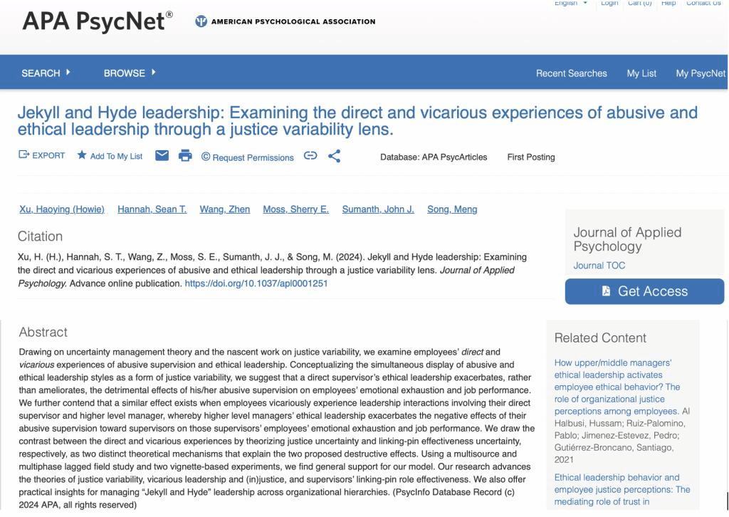 近日,我院王震教授以通讯作者在管理学领域顶级期刊Journal of Applied Psychology发表论文Jekyll and Hyde Leadership: Examining the direct and vicarious experiences of abusive and ethical leadership through a justice variability lens。论文合作者来自美国Stevens Institute of Technology、Wake Forest University和北京工业大学。JAP是FT50期刊和ABS-4*期刊、我校AAA类期刊。这也是王震教授以我院教师身份发表的第8篇FT50期刊论文。